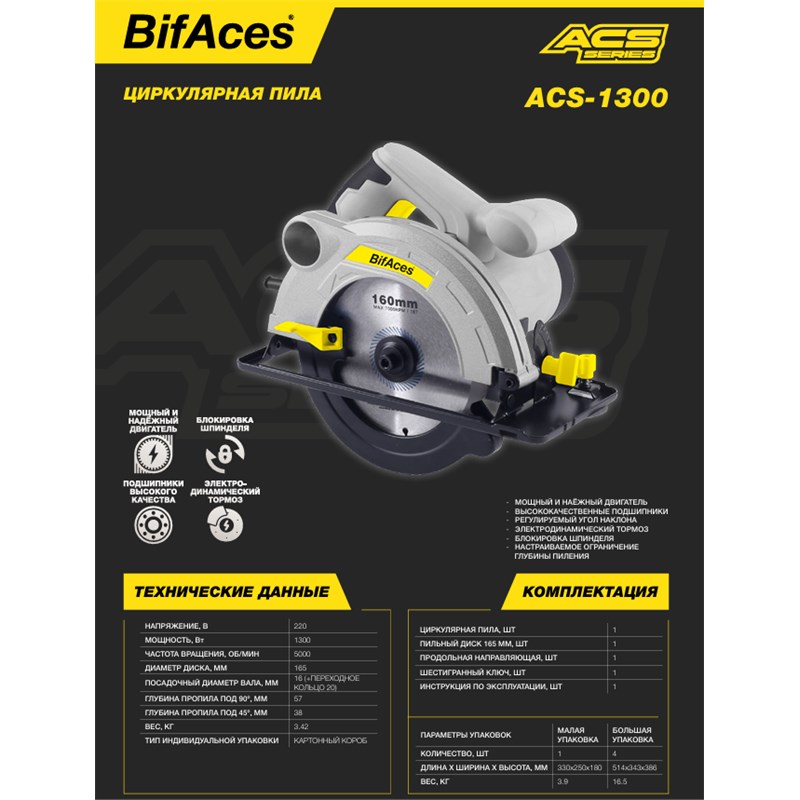 В корзину 690020061131: ACS-1300 Циркулярная сетевая пила BifAces ACS-1300Вт На складе: 28 3 696.00 ₽