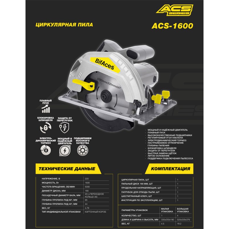В корзину 690020061161: ACS-1600 Циркулярная сетевая пила BifAces ACS-1600Вт На складе: 32 4 861.00 ₽