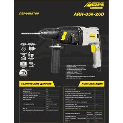 Электрический перфоратор BifAces ARH-800-26 - Напряжение 220В, Мощность: 800 ВТ, Скорость вращения 1150/мин, Частота ударов в минуту 5100уд/мин, Сила одиночного удара 2.6 Дж, Тип патрона SDS-plus, Есть 3 режима работы. Сверление / сверление с ударом / удар, предназначен для сверления отверстий в различных материалах (дерево, сталь, бетон, кирпич и т. д.). Есть режим направление вращения вала — по часовой стрелке или против, Есть ограничитель для глубины бурения. Есть дополнительная рукоятка. Есть функции Фиксация кнопки выключателя, Длинна кабеля 2,0м, Комплектность - Электрический перфоратор BifAces®, Сверло для перфоратора 3 шт, Долото для перфоратора 2шт, Патрон SDS-plus, Ограничитель глубины сверления, Рукоятка дополнительная, Инструкция по эксплуатации, Картонная упаковка, Кейс, 5шт/кор