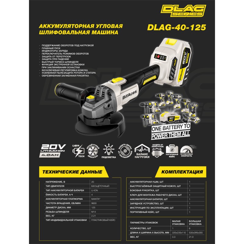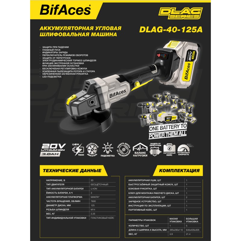 В корзину 690020063101: DLAG-40-125A Аккумуляторная угловая шлифовальная машина марки BifAces На складе: 46 4 785.00 ₽