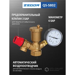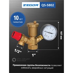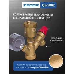 Группа безопасности эконом котла, бойлера и систем автономного отопления, материал корпуса латунь (CW617N), размер подключения 1“, комплектуется предохранительным клапаном 3 бар автоматическим воздухоотводчиком и манометром 6 бар, корпус без покрытия, рабочее давление 10 бар, максимальная рабочая температура не более 120 °С, возможная рабочая среда пар вода и незамерзающий теплоноситель (максимальное содержание гликолей – 50 %). 30шт/уп.