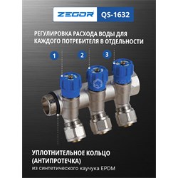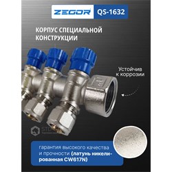 Коллектор вентильный в комплекте с евроконусом 16 мм, материал корпуса латунь (CW617N) с никелированием, размер подключения 3/4" НВ и 1" НВ с антипротечкой, размер выходов 1/2"х16 (евроконус 16), количество выходов от 2-х до 6-ти, рабочее давление 10 бар, максимальная рабочая температура 110 °С, пропускная способность 2,7 м3/час, коллектор ремонтопригоден и имеет 4000 циклов наработки на отказ. 4/32шт/уп.