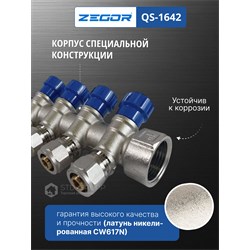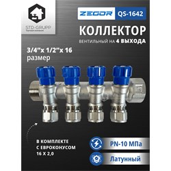 Коллектор вентильный в комплекте с евроконусом 16 мм, материал корпуса латунь (CW617N) с никелированием, размер подключения 3/4" НВ и 1" НВ с антипротечкой, размер выходов 1/2"х16 (евроконус 16), количество выходов от 2-х до 6-ти, рабочее давление 10 бар, максимальная рабочая температура 110 °С, пропускная способность 2,7 м3/час, коллектор ремонтопригоден и имеет 4000 циклов наработки на отказ. 2/24шт/уп.