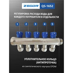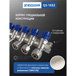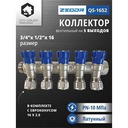 Коллектор вентильный в комплекте с евроконусом 16 мм, материал корпуса латунь (CW617N) с никелированием, размер подключения 3/4" НВ и 1" НВ с антипротечкой, размер выходов 1/2"х16 (евроконус 16), количество выходов от 2-х до 6-ти, рабочее давление 10 бар, максимальная рабочая температура 110 °С, пропускная способность 2,7 м3/час, коллектор ремонтопригоден и имеет 4000 циклов наработки на отказ. 2/24шт/уп.