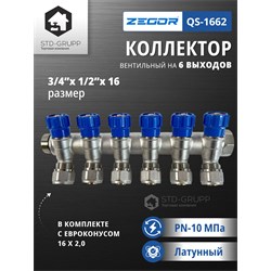 Коллектор вентильный в комплекте с евроконусом 16 мм, материал корпуса латунь (CW617N) с никелированием, размер подключения 3/4" НВ и 1" НВ с антипротечкой, размер выходов 1/2"х16 (евроконус 16), количество выходов от 2-х до 6-ти, рабочее давление 10 бар, максимальная рабочая температура 110 °С, пропускная способность 2,7 м3/час, коллектор ремонтопригоден и имеет 4000 циклов наработки на отказ. 2/24шт/уп.
