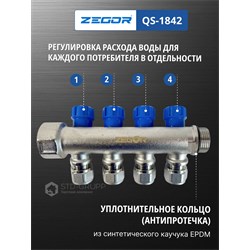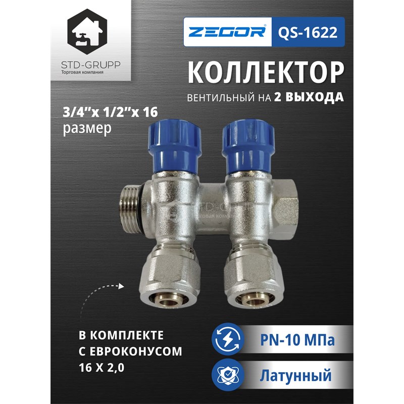 Коллектор вентильный в комплекте с евроконусом 16 мм, материал корпуса латунь (CW617N) с никелированием, размер подключения 3/4" НВ и 1" НВ с антипротечкой, размер выходов 1/2"х16 (евроконус 16), количество выходов от 2-х до 6-ти, рабочее давление 10 бар, максимальная рабочая температура 110 °С, пропускная способность 2,7 м3/час, коллектор ремонтопригоден и имеет 4000 циклов наработки на отказ. 2/16шт/уп.