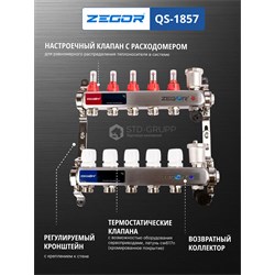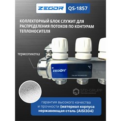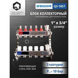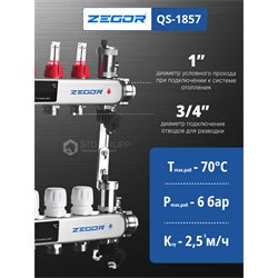Состоит из: - 1 возвратный коллектор, нержавеющая сталь AISI 304, с отсечными клапанами под сервопри воды; - 1 подающий коллектор, нержавеющая сталь AISI 304, с расходомерами; - 2 цельнометаллических кронштейна. - 2 дренажных клапана с автоматическим воздухоотводчиком. Размер подключения: 1″ (внутренняя резьба); Максимальное рабочее давление: 6 бар (10 бар для испытания оборудования); Максимальная рабочая температура: 70 °С (95 °С для испытания оборудования); Стандарт резьбы: ISO228; Выходы: от 2 до 12 с соединением 3/4″ Евроконус; Межосевое расстояние: 50 мм; Возможно использования термоэлектрических сервоприводов или аналогов с резьбой МЗ0х1,5; Сальниковое кольцо - резина EPDM; Коллекторный блок ремонтопригоден и имеет 5000 циклов наработки на отказ