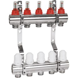 Коллекторный блок со встроенными расходомерами для тёплого пола, обратная линия оснащена термостатическими клапанами с возможностью оборудования сервоприводами, материал корпуса латунь (CW617N), размеры подключения подающей и обратной линий 1“, размеры подключения евроконуса 3/4", количество выходов от 2-х до 12-ти, покрытие корпуса гальваническое никелирование, рабочее давление 10 бар, максимальная рабочая температура 95°С, пропускная способность запорного клапана 2,5 м3/час, сальниковое кольцо из резины EPDM, коллекторный блок ремонтопригоден и имеет 5000 циклов наработки на отказ. 3шт/уп.