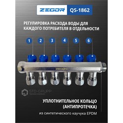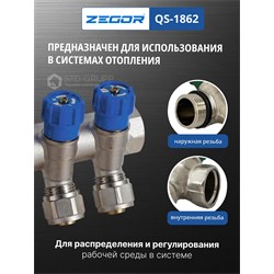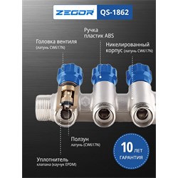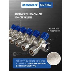 Коллектор вентильный в комплекте с евроконусом 16 мм, материал корпуса латунь (CW617N) с никелированием, размер подключения 3/4" НВ и 1" НВ с антипротечкой, размер выходов 1/2"х16 (евроконус 16), количество выходов от 2-х до 6-ти, рабочее давление 10 бар, максимальная рабочая температура 110 °С, пропускная способность 2,7 м3/час, коллектор ремонтопригоден и имеет 4000 циклов наработки на отказ