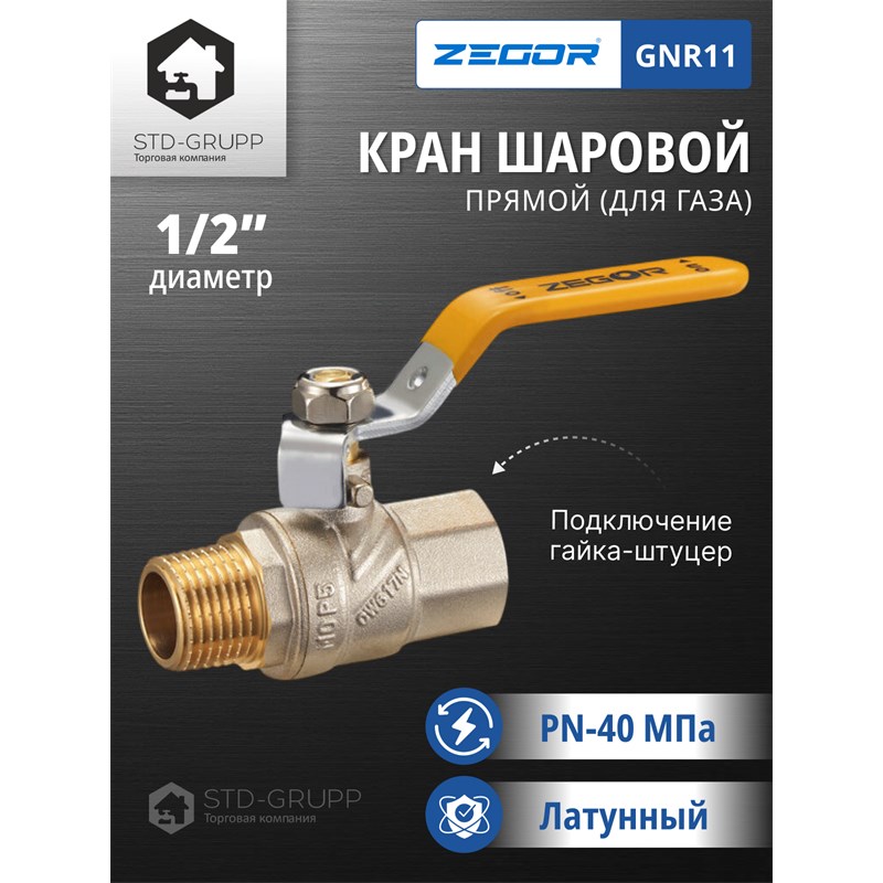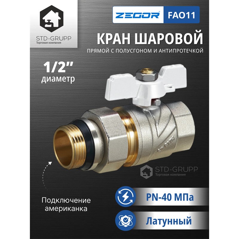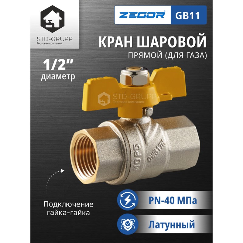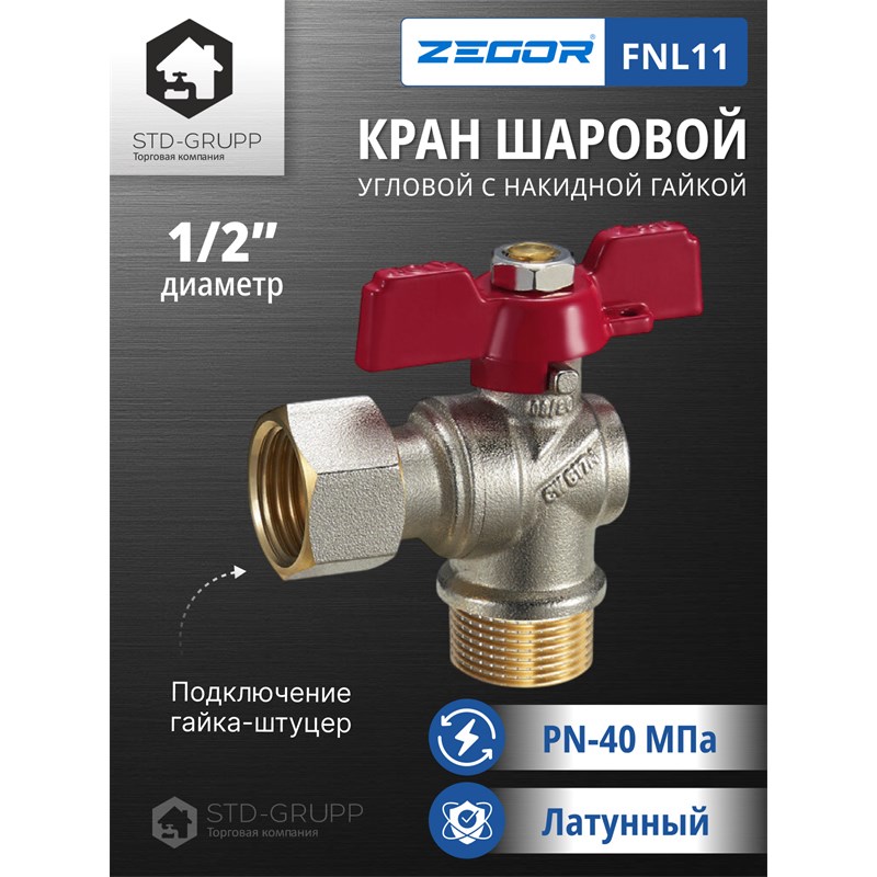 601021215151: FN11, Кран шаровый латунный (CW617N) 1/2" полнопроходной, ручка бабочка, гайка/штуцер (БГШ) (120)