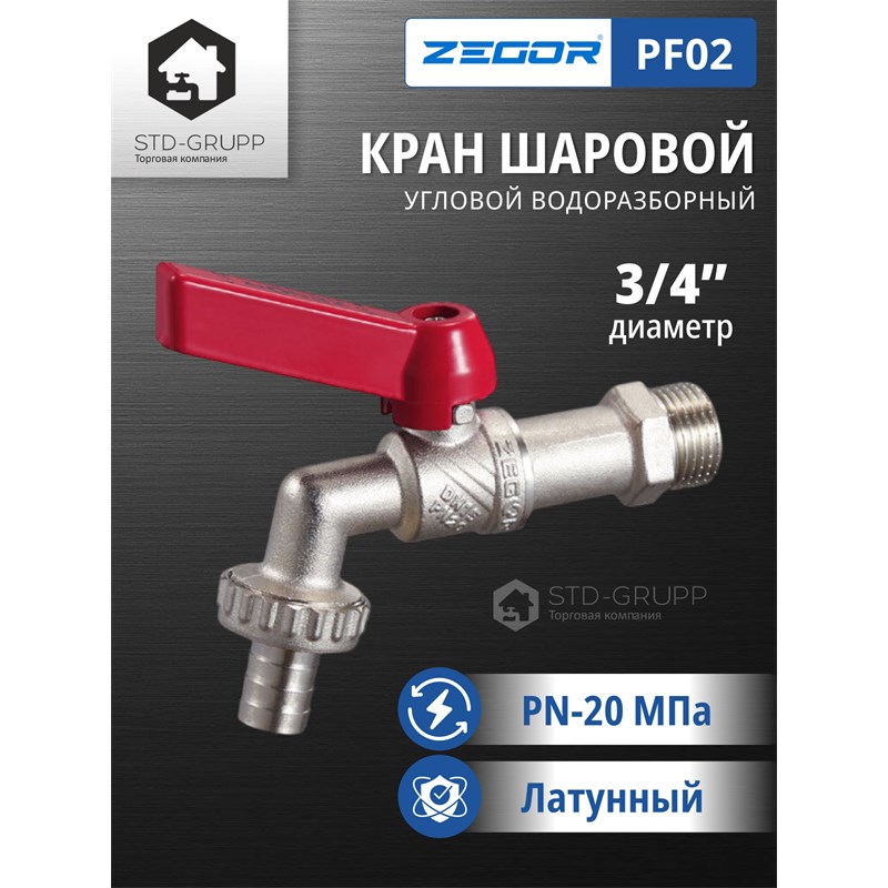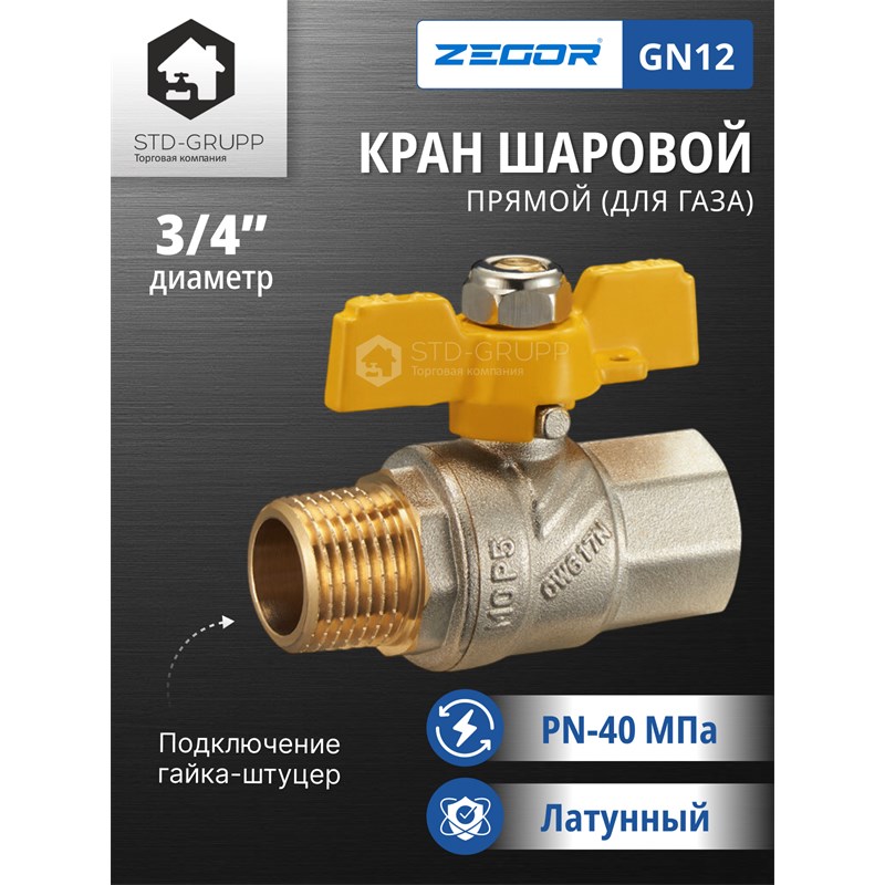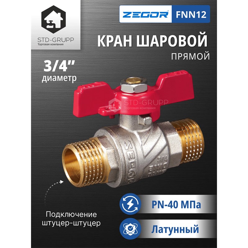 601021220202: FN12, Кран шаровый латунный (CW617N) 3/4" полнопроходной, ручка бабочка, гайка/штуцер (БГШ) (90)