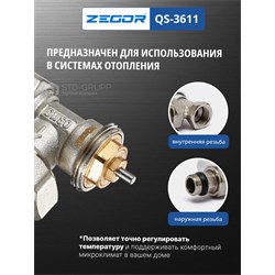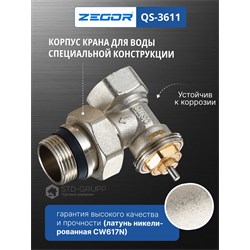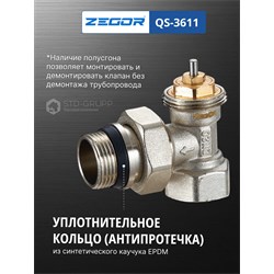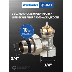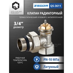 Клапан термостатический угловой, материал корпуса латунь (CW617N) с никелированием, диаметр подключения 3/4“ НВ с антипротечкой, максимальное рабочее давление 10 бар, максимальная рабочая температура 120 °С, резьба подключения термоголовки М30 × 1,5. 10/80шт/уп.