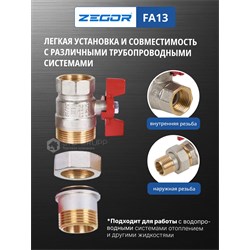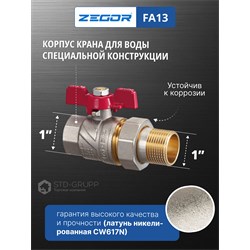 Кран-американка прямой шаровой латунный 1" (CW617N) полно проходной с полу сгоном ручка-бабочка. 7/42шт/уп.
