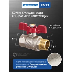Кран шаровой латунный 1" (CW617N) полно проходной ручка бабочка подключение гайка-штуцер (БГШ). 15/60шт/уп.