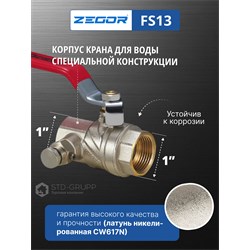 Кран шаровой латунный 1" (CW617N) полно проходной с дренажём и воздухоотводчиком ручка подключение гайка-гайка (РГГ). 7/42шт/уп.