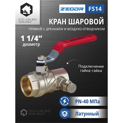 Кран шаровой латунный 1 1/4" (CW617N) полно проходной с дренажём и воздухоотводчиком ручка подключение гайка-гайка (РГГ). 8/32шт/уп.