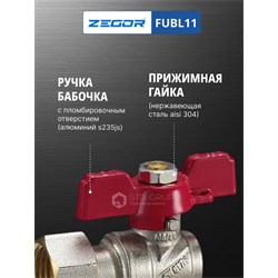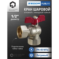 Кран шаровой угловой латунный 1/2" (CW617N) полно проходной с накидной гайкой бабочка подключение гайка-гайка (БГГ). 20/120шт/уп.