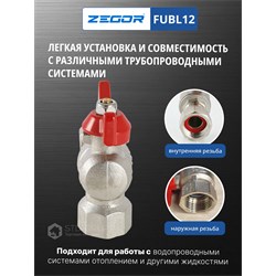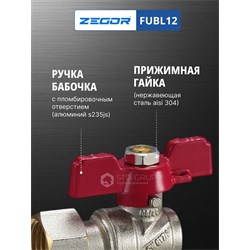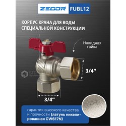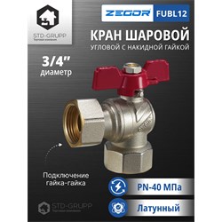 Кран шаровой угловой латунный 3/4" (CW617N) полно проходной с накидной гайкой бабочка подключение гайка-гайка (БГГ). 15/90шт/уп.