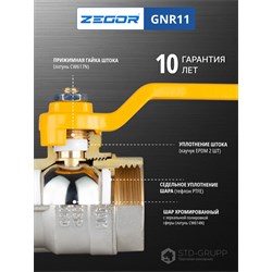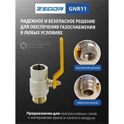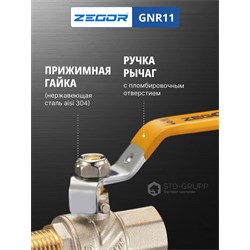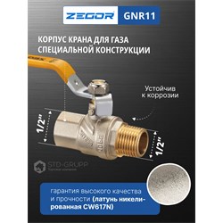 Кран шаровой латунный для газа 1/2" (CW617N) полно проходной ручка подключение гайка-штуцер (РГШ). 20/120шт/уп.