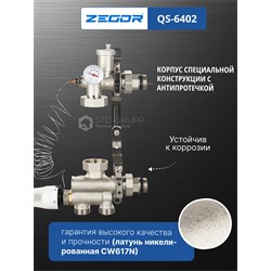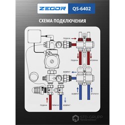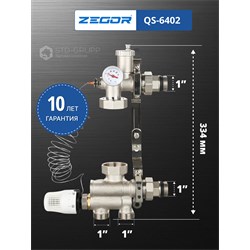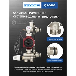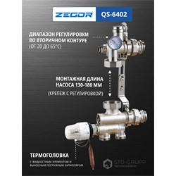 Насосно-смесительный узел с нижним подводом, материал корпуса латунь (CW617N) с никелированием, диаметр подключения подающей линии 1“ НР, диаметр подключения обратной линии 1“ НР, диаметр подключения к коллектору 1“ НР с антипротечкой, монтажная длина насоса 130-180 мм (крепёж с регулировкой), диапазон регулировки во вторичном контуре от 20 до 65 °C, максимальное рабочее давление 10 бар, максимальная рабочая температура 95 °С, размер гаек циркуляционного насоса 1"1/2", резьба подключения термоголовки с погружным датчиком М30 × 1,5. 6шт/уп.