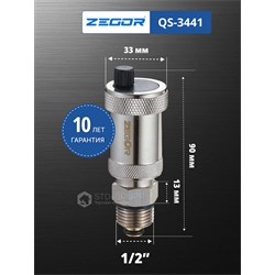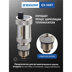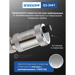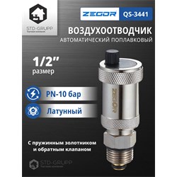 Автоматический воздухоотводчик поплавкового типа с пружинным золотником и обратным клапаном 1/2", материал корпуса латунь CW617N с хромированием, диаметр подключения 1/2“ НР, максимальное рабочее давление 10 бар, максимальная рабочая температура 110 °С. 100шт/уп.