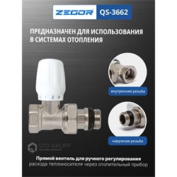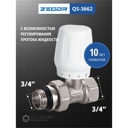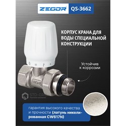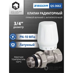 Кран радиаторный прямой верхний, материал корпуса латунь (CW617N) с никелированием, диаметр подключения 3/4“ НВ с антипротечкой, максимальное рабочее давление 10 бар. 8/72шт/уп
