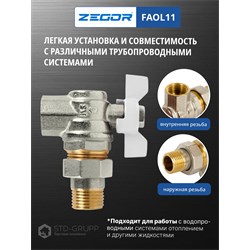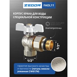 Кран-американка угловой шаровой латунный 1/2" (CW617N) полно проходной с полу сгоном и антипротечкой ручка-бабочка. 15/90шт/уп.