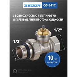 Клапан термостатический прямой, материал корпуса латунь (CW617N) с никелированием, диаметр подключения 1/2“ НВ с антипротечкой, максимальное рабочее давление 10 бар, максимальная рабочая температура 120 °С, резьба подключения термоголовки М30 × 1,5. 10/100шт/уп.