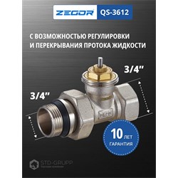 Клапан термостатический прямой, материал корпуса латунь (CW617N) с никелированием, диаметр подключения 3/4“ НВ с антипротечкой, максимальное рабочее давление 10 бар, максимальная рабочая температура 120 °С, резьба подключения термоголовки М30 × 1,5. 10/80шт/уп.