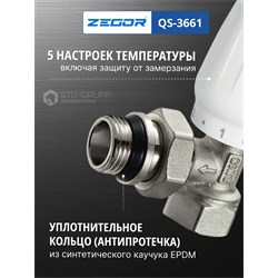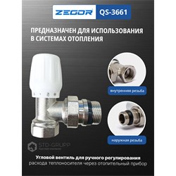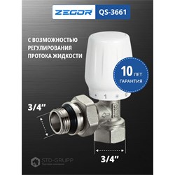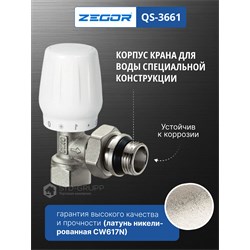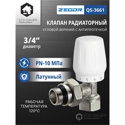 Кран радиаторный угловой верхний, материал корпуса латунь (CW617N) с никелированием, диаметр подключения 3/4“ НВ с антипротечкой, максимальное рабочее давление 10 бар, максимальная рабочая температура 120 °С. 8/72шт/уп.