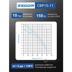 Мощность P1 150 Вт, макс.напор 11 м макс.расход 1,5 м3/час, длина кабеля 1,5м с евро вилкой, насосная камера из чугуна с катафорезным покрытием, рабочее колесо высокопрочный техполимер, вал двигателя металлокерамика, обмотка статора медь, макс температура перекачиваемой жидкости +90 градусов, давление в системе 6 бар Гарантия: 24 месяца.