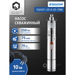 Диаметр скважины 95-110мм. ⌀ корпуса 3"(75мм), Мощность P1 250 Вт, Макс.напор 70 м, Макс.расход 1,7 м3/час, Диаметр присоединения 1", Фланец переходной из нерж. стали, Узел шнековый двухзаходная резиновая обойма и шнек с хромированым покрытием, Обмотка статора медь, Вал двигателя нерж. сталь AISI 304, Длина кабеля 10 м Гарантия: 24 месяцев.