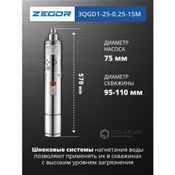 Диаметр скважины 95-110мм. ⌀ корпуса 3"(75мм), Мощность P1 250 Вт, Макс.напор 70 м, Макс.расход 1,7 м3/час, Диаметр присоединения 1", Фланец переходной из нерж. стали, Узел шнековый двухзаходная резиновая обойма и шнек с хромированым покрытием, Обмотка статора медь, Вал двигателя нерж. сталь AISI 304, Длина кабеля 15 м Гарантия: 24 месяцев.