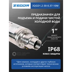 Диаметр скважины 95-110мм. ⌀ корпуса 3"(75мм), Мощность P1 370 Вт, Макс.напор 90 м, Макс.расход 1,9 м3/час, Диаметр присоединения 1", Фланец переходной из нерж. стали, Узел шнековый двухзаходная резиновая обойма и шнек с хромированым покрытием, Обмотка статора медь, Вал двигателя нерж. сталь AISI 304, Длина кабеля 10 м Гарантия: 24 месяцев.