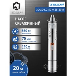 Диаметр скважины 95-110мм. ⌀ корпуса 3"(75мм), Мощность P1 550 Вт, Макс.напор 110 м, Макс.расход= 1,9 м3/час, Диаметр присоединения 1", Фланец переходной из нерж. стали, Узел шнековый двухзаходная резиновая обойма и шнек с хромированым покрытием, Обмотка статора медь, Вал двигателя нерж. сталь AISI 304, Длина кабеля 20 м Гарантия: 24 месяцев.