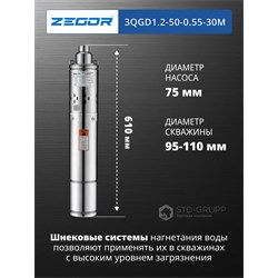 Диаметр скважины 95-110мм. ⌀ корпуса 3"(75мм), Мощность P1 550 Вт, Макс.напор 110 м, Макс.расход= 1,9 м3/час, Диаметр присоединения 1", Фланец переходной из нерж. стали, Узел шнековый двухзаходная резиновая обойма и шнек с хромированым покрытием, Обмотка статора медь, Вал двигателя нерж. сталь AISI 304, Длина кабеля 30 м Гарантия: 24 месяцев.