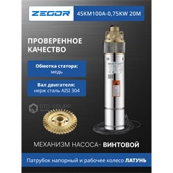 Диаметр скважины 120-150мм. ⌀ корпуса 4"(100мм), Мощность P1 750 Вт, Макс.напор 58 м, Макс.расход 3,0 м3/час, Диаметр присоединения 1", Фланец переходной из латуни, Рабочее колесо из латуни, Корпус насосной камеры из латуни, Наружная автоматика, Обмотка статора медь, Вал двигателя нерж. сталь AISI 304, Длина кабеля 20 м Гарантия: 24 месяцев.