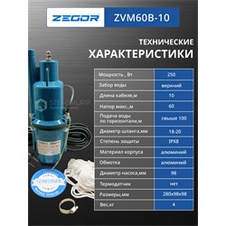 Мощность P1 250 Вт, Номинальное напряжение питающей сети: 220 В. Частота: 50 Гц. Класс защиты от поражения электрическим током: II. Степень защиты от влаги: IPX8. Максимальная рабочая глубина погружения под зеркало воды: 3 м. кабель 10 м с евровилкой. Гарантия: 12 месяцев. 6шт/уп.