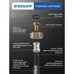 Подводка для воды (гайка - гайка), накидная гайка из гальванизированной нержавеющей стали (SUS 201), внешняя оплётка комбинированная из нейлона и нержавеющей стали (SUS 304), завальцовка латунная, внутрення трубка из каучука EPDM, рабочее давление 10 кПа, длина 180 см. 50шт/уп.