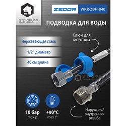Подводка для воды (гайка - гайка), накидная гайка из гальванизированной нержавеющей стали (SUS 201), внешняя оплётка комбинированная из нейлона и нержавеющей стали (SUS 304), завальцовка латунная, внутрення трубка из каучука EPDM, рабочее давление 10 кПа, длина 40 см. 100шт/уп.