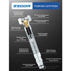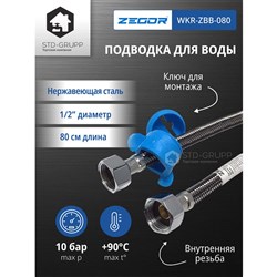 Подводка для воды (гайка - штуцер), накидная гайка из гальванизированной нержавеющей стали (SUS 201), внешняя оплётка комбинированная из нейлона и нержавеющей стали (SUS 304), завальцовка латунная, внутрення трубка из каучука EPDM, рабочее давление 10 кПа, длина 80см. 100шт/уп.