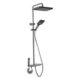 душевая система для ванной 4 позиционная, технология производства токарная обработка, материал корпуса Латунь (Lt) и нержавеющая сталь (SUS 304), встроенный излив, покрытие тёмный графит матовый, встр. в корпус кнопочное переключение на душевую систему(тропический душ), переносную лейку с душевым шлангом и гигиеническую лейку и гибким шлангом