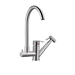 м-ль для кух. мойки, технология производства токарная обработка, материал корпуса нерж. cталь SUS 304 (пищевая), с пов. круглым изливом 360° и доп. выдвижной лейкой, картридж ø35, без покрытия, крепление гайка-втулка. Длина подводки 55см. 10шт/уп.