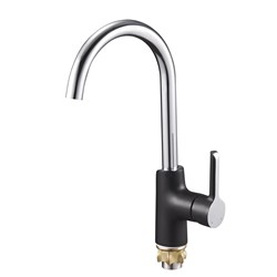 см-ль для кух. мойки, техналогия производства литьё в песчаную форму, материал корпуса латунь (Lt), с пов. круглым изливом 360°, картридж трёхступенчатый с функцией экономии воды ø35, покрытие комбинированное хром и чёрное матовое, крепление гайка-втулка корона. Длина подводки 55см. 10шт/уп.