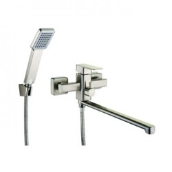 см-ль для ванной, технология производства литьё под давлением, материал корпуса цинк (Zn), с пов. плоским изливом 360°, картридж ø35, покрытие САТИН, встр. в корпус картриджное переключение на душ (подключение шланга через излив). 8шт/уп.