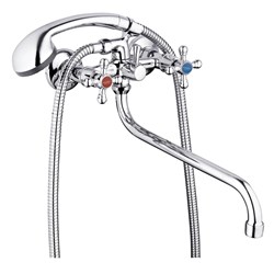 Смеситель для ванной, технология производства литьё в песчаную форму, материал корпуса цинк (Zn), с пов. S-образным круглым изливом 360°, резиновая букса (3/8), покрытие хром, штоковое переключение на душ. 10шт/уп.