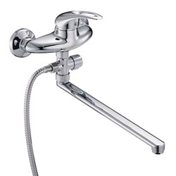 см-ль для ванной, технология производства литьё в песчаную форму, материал корпуса цинк (Zn), с пов. плоским изогнутым изливом 360°, картридж ø40, покрытие хром, выносной картриджный дивертор на душ. 10шт/уп.