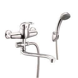см-ль для ванной, технология производства литьё в песчаную форму, материал корпуса цинк (Zn), с пов. плоским изогнутым изливом 360°, картридж ø40, покрытие хром, выносной картриджный дивертор на душ. 10шт/уп.