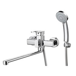 см-ль для ванной, техналогия производства литьё под давлением, материал корпуса цинк (Zn), с пов. плоским изливом 360°, картридж ø35, покрытие хром, встр. в корпус картриджное переключение на душ. 8шт/уп.