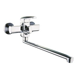 см-ль для ванной, технология производства литьё под давлением, материал корпуса цинк (Zn), с пов. плоским изливом 360°, картридж ø35, покрытие хром, встр. в корпус картриджное переключение на душ. 10шт/уп.